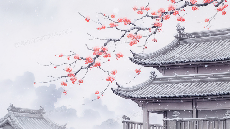 本作品内容为冬季古建筑梅花插画, 格式为 jpg, 大小6 MB, 图片尺寸为2912 x 1632, 源文件无水印, 欢迎使用熊猫办公。 如认为平台内容涉嫌侵权,可通过邮件:tousu@tukuppt.com提出书面通知,我们将及时处理。