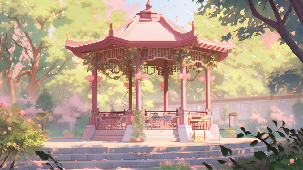 首页 > 插画 > 科技艺术 > 水彩手绘 > 春季公园里精致的凉亭插画