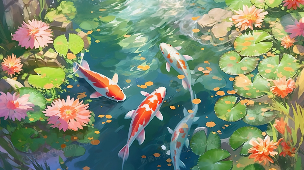 本作品内容为彩色池塘中的锦鲤鲤鱼插画, 格式为 jpg, 大小6 MB, 图片尺寸为2912 x 1632, 源文件无水印, 欢迎使用熊猫办公。 如认为平台内容涉嫌侵权,可通过邮件:tousu@tukuppt.com提出书面通知,我们将及时处理。