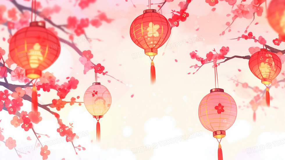 本作品内容为中国新年鲜花彩灯灯笼装饰插画, 格式为 jpg, 大小2 MB, 图片尺寸为1456 x 816, 源文件无水印, 欢迎使用熊猫办公。 如认为平台内容涉嫌侵权,可通过邮件:tousu@tukuppt.com提出书面通知,我们将及时处理。
