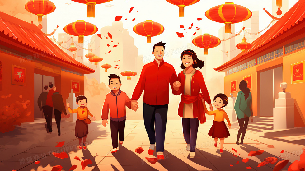本作品内容为春节外出拜年的一家四口插画, 格式为 jpg, 大小5 MB, 图片尺寸为2912 x 1632, 源文件无水印, 欢迎使用熊猫办公。 如认为平台内容涉嫌侵权,可通过邮件:tousu@tukuppt.com提出书面通知,我们将及时处理。
