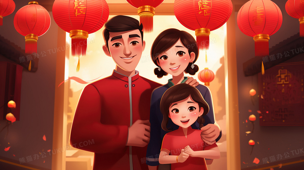 本作品内容为春节庆典里温馨的一家三口插画, 格式为 jpg, 大小5 MB, 图片尺寸为2912 x 1632, 源文件无水印, 欢迎使用熊猫办公。 如认为平台内容涉嫌侵权,可通过邮件:tousu@tukuppt.com提出书面通知,我们将及时处理。