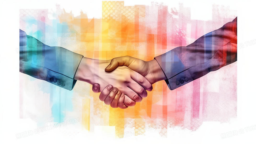 本作品内容为彩色渲染人际交往友好握手插画, 格式为 jpg, 大小6 MB, 图片尺寸为2912 x 1632, 源文件无水印, 欢迎使用熊猫办公。 如认为平台内容涉嫌侵权,可通过邮件:tousu@tukuppt.com提出书面通知,我们将及时处理。