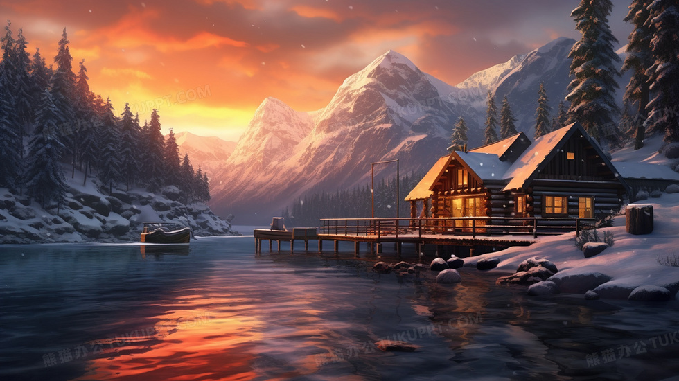 本作品内容为冬天雪山下山谷湖边的小木屋创意插画, 格式为 jpg, 大小6 MB, 图片尺寸为2912 x 1632, 源文件无水印, 欢迎使用熊猫办公。 如认为平台内容涉嫌侵权,可通过邮件:tousu@tukuppt.com提出书面通知,我们将及时处理。