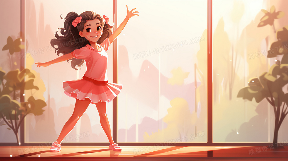 本作品内容为可爱的小女孩练习跳舞创意插画, 格式为 jpg, 大小5 MB, 图片尺寸为2912 x 1632, 源文件无水印, 欢迎使用熊猫办公。 如认为平台内容涉嫌侵权,可通过邮件:tousu@tukuppt.com提出书面通知,我们将及时处理。