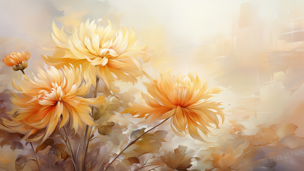 本作品内容为秋日盛开的唯美金色菊花特写插画, 格式为 jpg, 大小6 MB, 图片尺寸为2912 x 1632, 源文件无水印, 欢迎使用熊猫办公。 如认为平台内容涉嫌侵权,可通过邮件:tousu@tukuppt.com提出书面通知,我们将及时处理。