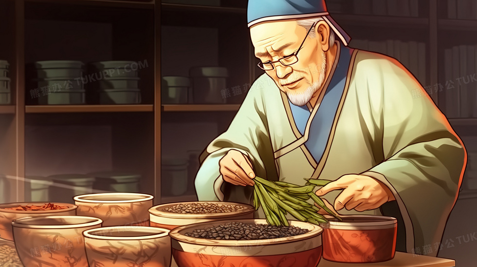 本作品内容为中国风老中医抓药材插画, 格式为 jpg, 大小5 MB, 图片尺寸为2912 x 1632, 源文件无水印, 欢迎使用熊猫办公。 如认为平台内容涉嫌侵权,可通过邮件:tousu@tukuppt.com提出书面通知,我们将及时处理。