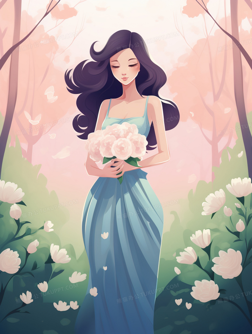 本作品内容为树林花朵中穿裙子的长发美女插画, 格式为 jpg, 大小4 MB, 图片尺寸为1856 x 2464, 源文件无水印, 欢迎使用熊猫办公。 如认为平台内容涉嫌侵权,可通过邮件:tousu@tukuppt.com提出书面通知,我们将及时处理。