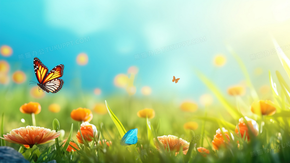 本作品内容为春天阳光下草地花丛中的花蝴蝶插画, 格式为 jpg, 大小4 MB, 图片尺寸为2912 x 1632, 源文件无水印, 欢迎使用熊猫办公。 如认为平台内容涉嫌侵权,可通过邮件:tousu@tukuppt.com提出书面通知,我们将及时处理。