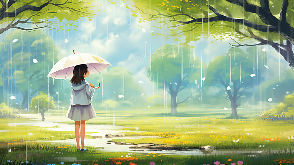 下雨天绿色草地上撑伞的女孩风景唯美插画