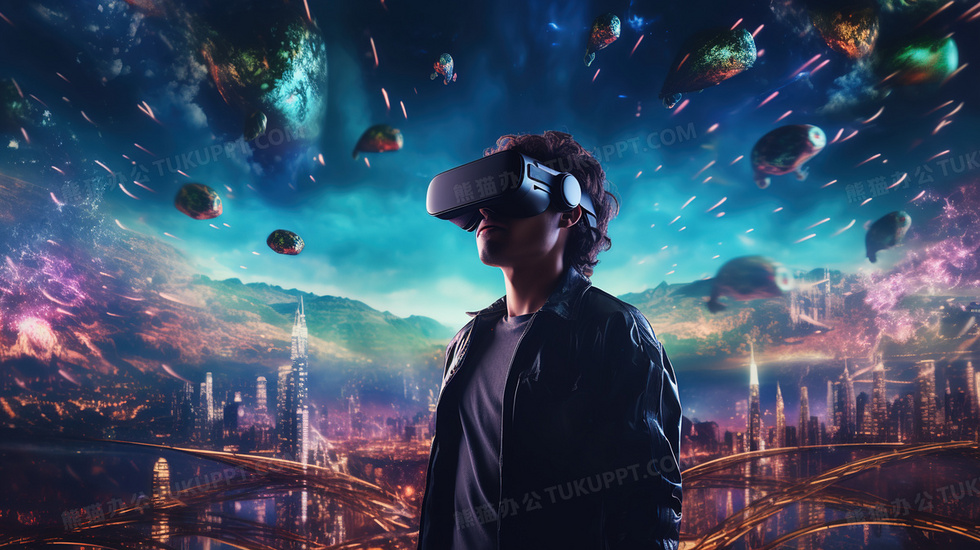 本作品内容为戴着VR眼镜沉浸在虚拟超现实世界的年轻人插画, 格式为 jpg, 大小6 MB, 图片尺寸为2912 x 1632, 源文件无水印, 欢迎使用熊猫办公。 如认为平台内容涉嫌侵权,可通过邮件:tousu@tukuppt.com提出书面通知,我们将及时处理。