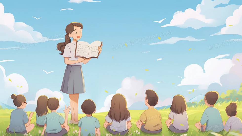 本作品内容为蓝天白云草地室外老师认真上课学生认真听课创意插画, 格式为 jpg, 大小5 MB, 图片尺寸为2912 x 1632, 源文件无水印, 欢迎使用熊猫办公。 如认为平台内容涉嫌侵权,可通过邮件:tousu@tukuppt.com提出书面通知,我们将及时处理。