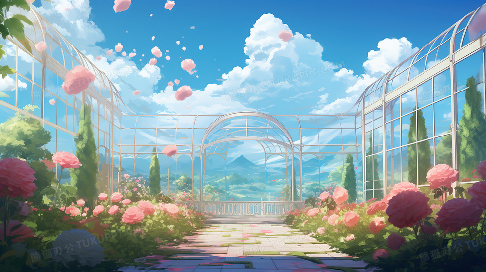 本作品内容为蓝天白云唯美梦幻玻璃花房下的粉色玫瑰花创意插画, 格式为 jpg, 大小6 MB, 图片尺寸为2912 x 1632, 源文件无水印, 欢迎使用熊猫办公。 如认为平台内容涉嫌侵权,可通过邮件:tousu@tukuppt.com提出书面通知,我们将及时处理。