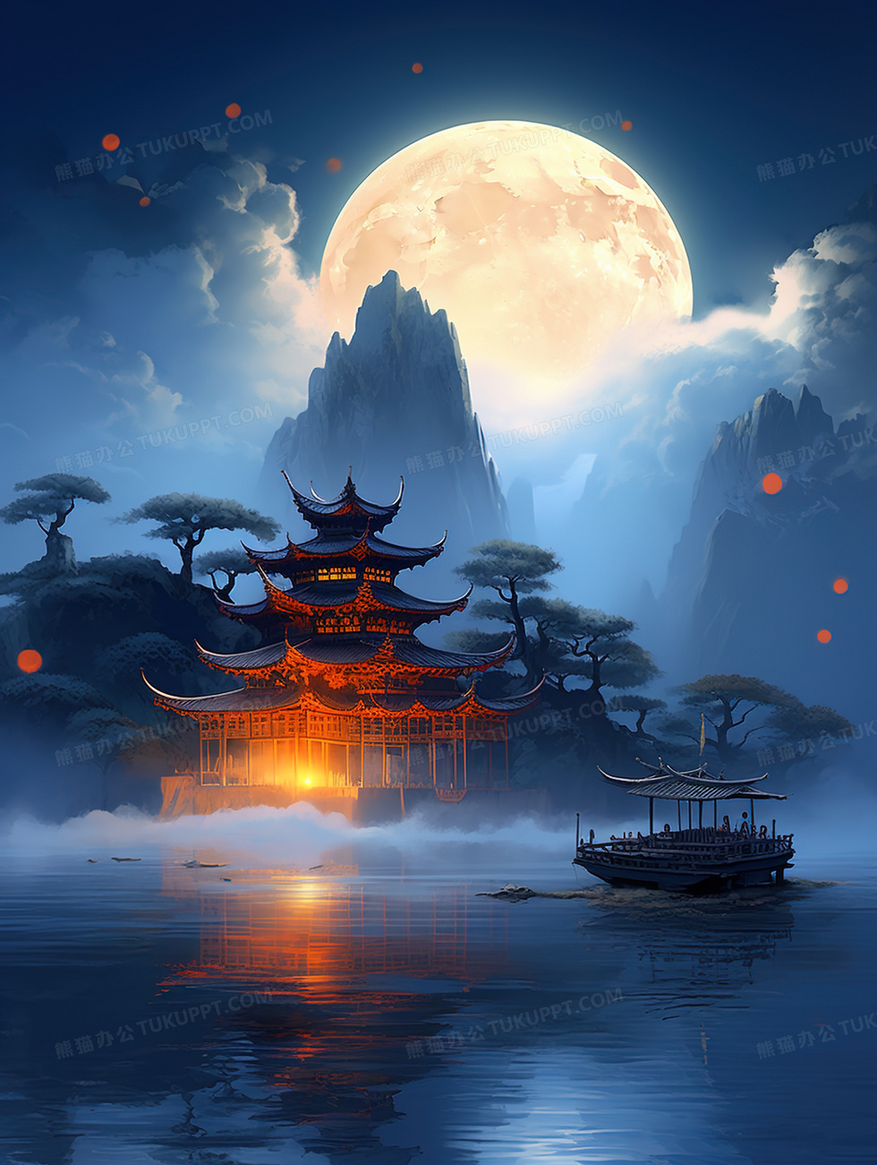 本作品内容为中国风夜晚山中楼阁建筑山水风景插画, 格式为 jpg, 大小5 MB, 图片尺寸为1856 x 2464, 源文件无水印, 欢迎使用熊猫办公。 如认为平台内容涉嫌侵权,可通过邮件:tousu@tukuppt.com提出书面通知,我们将及时处理。