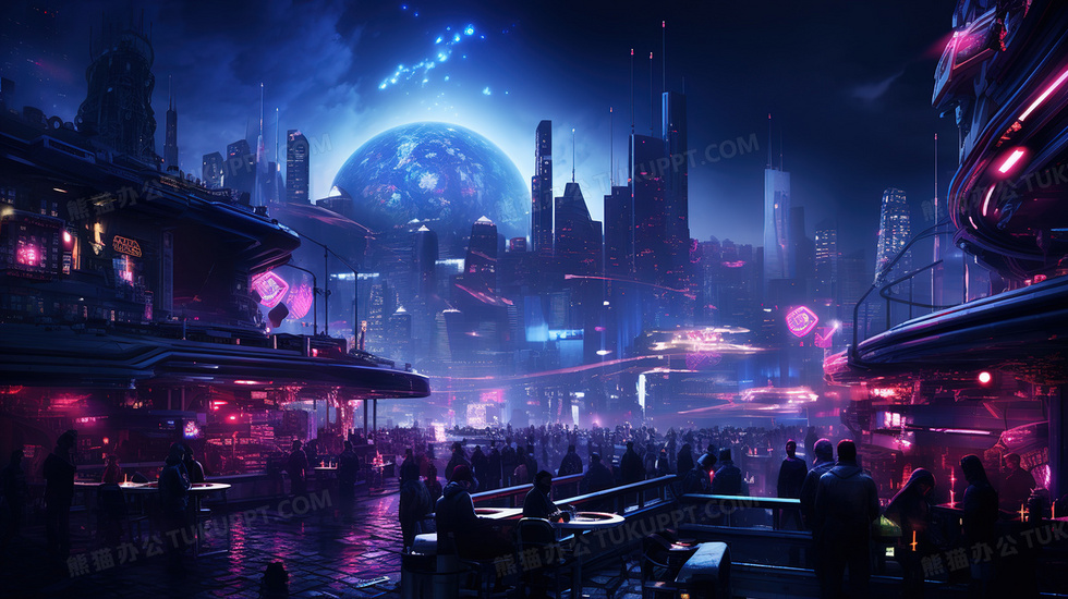 本作品内容为赛博朋克风格创意霓虹街景创意插画, 格式为 jpg, 大小7 MB, 图片尺寸为2912 x 1632, 源文件无水印, 欢迎使用熊猫办公。 如认为平台内容涉嫌侵权,可通过邮件:tousu@tukuppt.com提出书面通知,我们将及时处理。