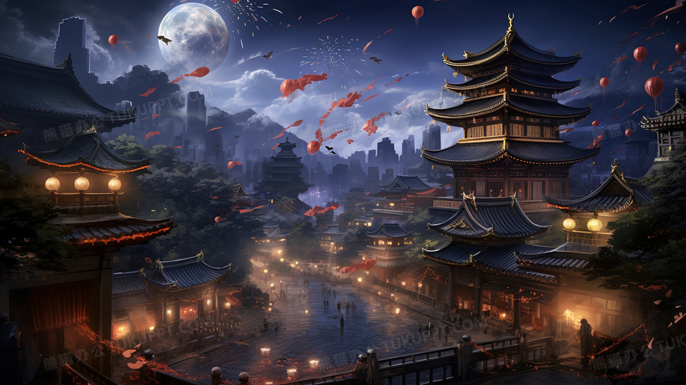 本作品内容为灯火通明的中国古代城镇夜景插画, 格式为 jpg, 大小7 MB, 图片尺寸为2912 x 1632, 源文件无水印, 欢迎使用熊猫办公。 如认为平台内容涉嫌侵权,可通过邮件:tousu@tukuppt.com提出书面通知,我们将及时处理。