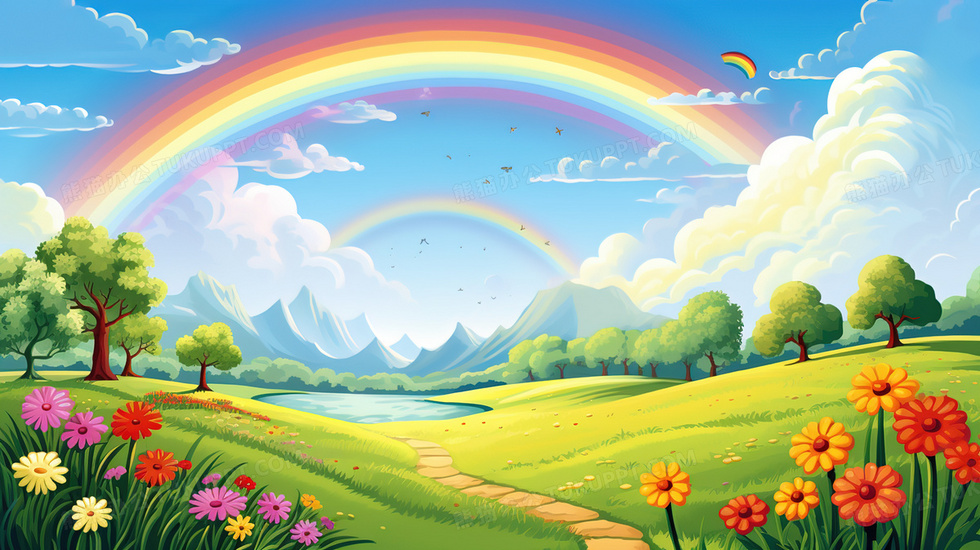 本作品内容为草地花丛上天空中的彩虹插画, 格式为 jpg, 大小5 MB, 图片尺寸为2912 x 1632, 源文件无水印, 欢迎使用熊猫办公。 如认为平台内容涉嫌侵权,可通过邮件:tousu@tukuppt.com提出书面通知,我们将及时处理。