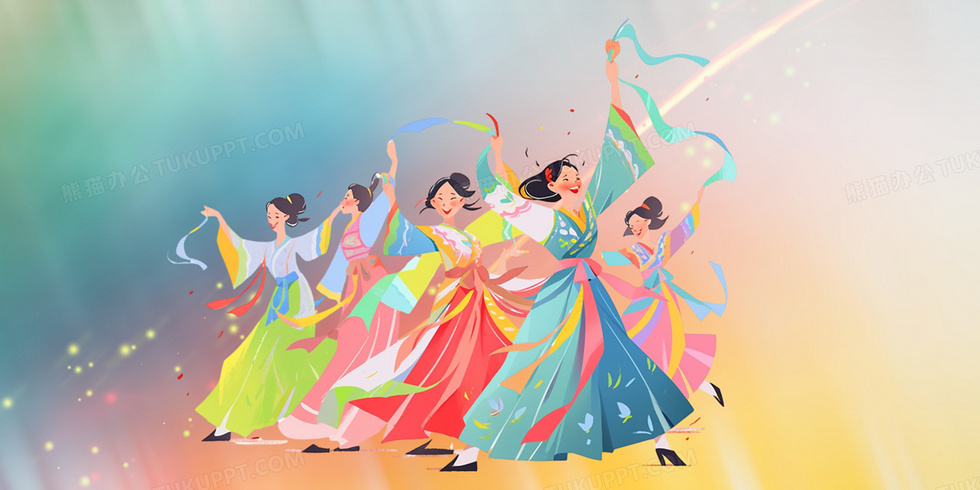 本作品内容为绚丽民族舞背景, 格式为 psd, 大小35 MB, 图片尺寸为4724 x 2362, 作品中背景图片无需修改, 源文件无水印,可以直接使用, 欢迎使用熊猫办公。 如认为平台内容涉嫌侵权,可通过邮件:tousu@tukuppt.com提出书面通知,我们将及时处理。