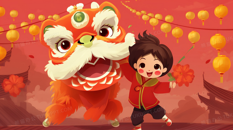本作品内容为春节庆典的小孩和醒狮插画, 格式为 jpg, 大小5 MB, 图片尺寸为2912 x 1632, 源文件无水印, 欢迎使用熊猫办公。 如认为平台内容涉嫌侵权,可通过邮件:tousu@tukuppt.com提出书面通知,我们将及时处理。