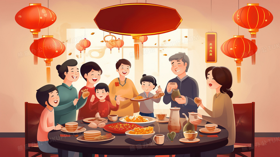 本作品内容为春节一家人围桌吃年夜饭插画, 格式为 jpg, 大小5 MB, 图片尺寸为2912 x 1632, 源文件无水印, 欢迎使用熊猫办公。 如认为平台内容涉嫌侵权,可通过邮件:tousu@tukuppt.com提出书面通知,我们将及时处理。