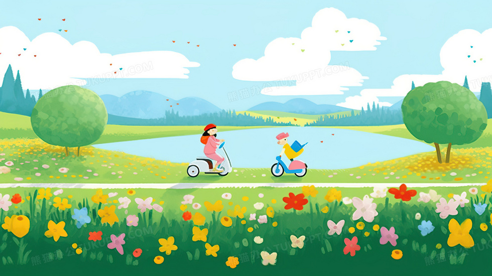 本作品内容为郊外湖边花丛草地上骑自行车的小孩插画, 格式为 jpg, 大小5 MB, 图片尺寸为2912 x 1632, 源文件无水印, 欢迎使用熊猫办公。 如认为平台内容涉嫌侵权,可通过邮件:tousu@tukuppt.com提出书面通知,我们将及时处理。