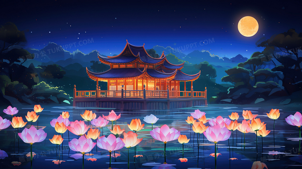 本作品内容为湖面亭子周围漂浮着许多荷花灯创意插画, 格式为 jpg, 大小6 MB, 图片尺寸为2912 x 1632, 源文件无水印, 欢迎使用熊猫办公。 如认为平台内容涉嫌侵权,可通过邮件:tousu@tukuppt.com提出书面通知,我们将及时处理。