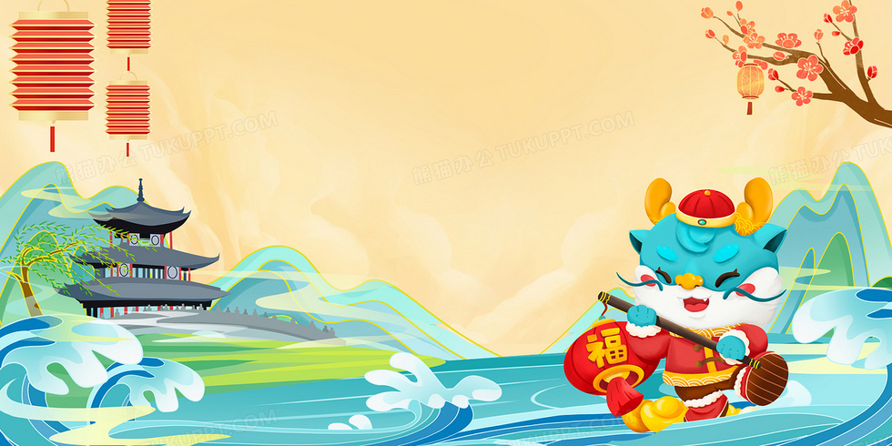本作品内容为中国风龙年新年龙年送福背景, 格式为 psd, 大小26 MB, 图片尺寸为4724 x 2362, 作品中背景图片无需修改, 源文件无水印,可以直接使用, 欢迎使用熊猫办公。 如认为平台内容涉嫌侵权,可通过邮件:tousu@tukuppt.com提出书面通知,我们将及时处理。