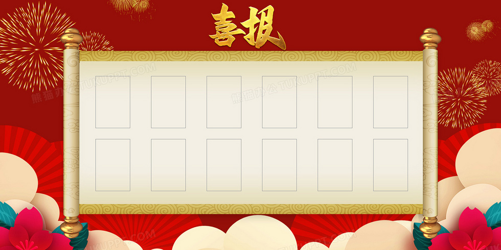 本作品内容为剪纸风红色系喜庆喜报榜单背景, 格式为 psd, 大小18 MB, 图片尺寸为4724 x 2362, 作品中背景图片无需修改, 源文件无水印,可以直接使用, 欢迎使用熊猫办公。 如认为平台内容涉嫌侵权,可通过邮件:tousu@tukuppt.com提出书面通知,我们将及时处理。