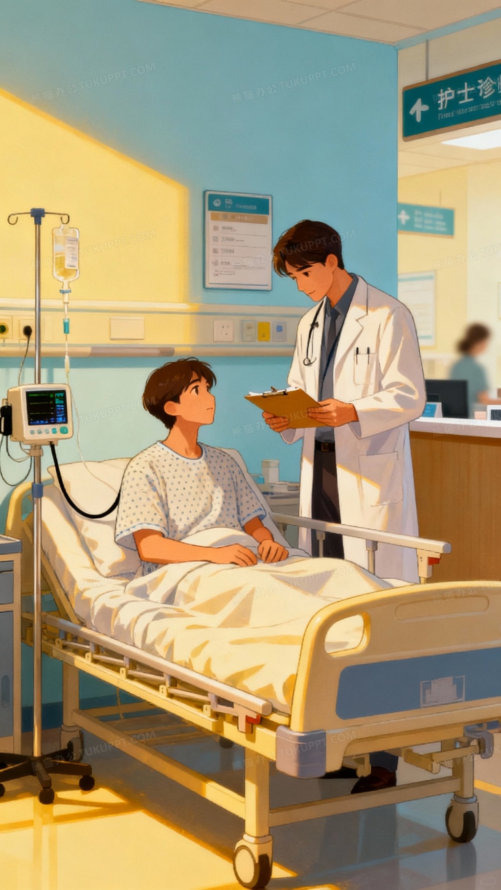 本作品内容为医生在医院给病人看病的插画, 格式为 jpg, 大小1 MB, 图片尺寸为1440 x 2560, 源文件无水印, 欢迎使用熊猫办公。 如认为平台内容涉嫌侵权,可通过邮件:tousu@tukuppt.com提出书面通知,我们将及时处理。