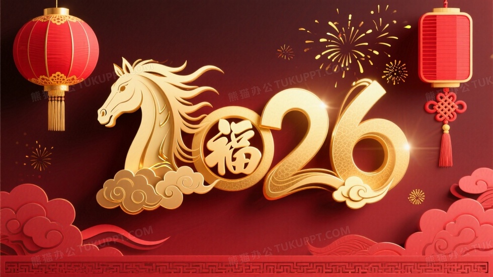本作品内容为2026年马年春节主题海报, 格式为 jpg, 大小1 MB, 图片尺寸为1664 x 936, 作品中背景图片无需修改, 源文件无水印,可以直接使用, 欢迎使用熊猫办公。 如认为平台内容涉嫌侵权,可通过邮件:tousu@tukuppt.com提出书面通知,我们将及时处理。