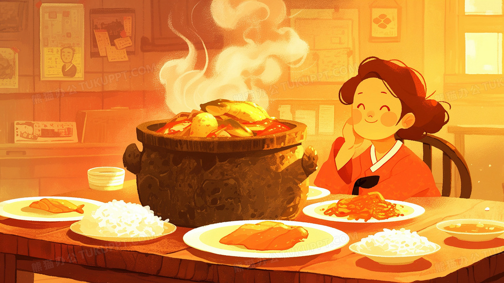 本作品内容为女孩吃冒着热气的韩国部队火锅美食插画, 格式为 jpg, 大小3 MB, 图片尺寸为2912 x 1632, 源文件无水印, 欢迎使用熊猫办公。 如认为平台内容涉嫌侵权,可通过邮件:tousu@tukuppt.com提出书面通知,我们将及时处理。