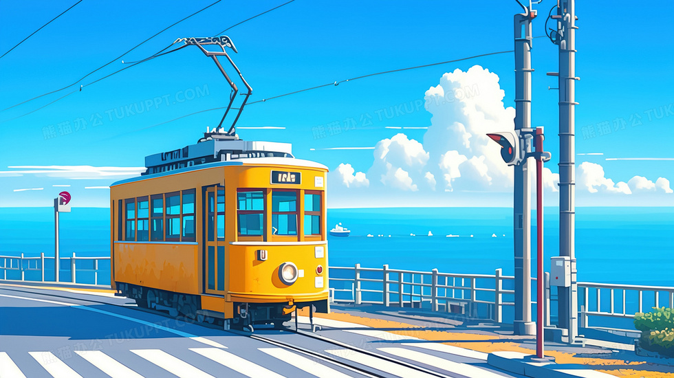本作品内容为蓝天白云海边道路上行驶的有轨电车插画, 格式为 jpg, 大小3 MB, 图片尺寸为2912 x 1632, 源文件无水印, 欢迎使用熊猫办公。 如认为平台内容涉嫌侵权,可通过邮件:tousu@tukuppt.com提出书面通知,我们将及时处理。