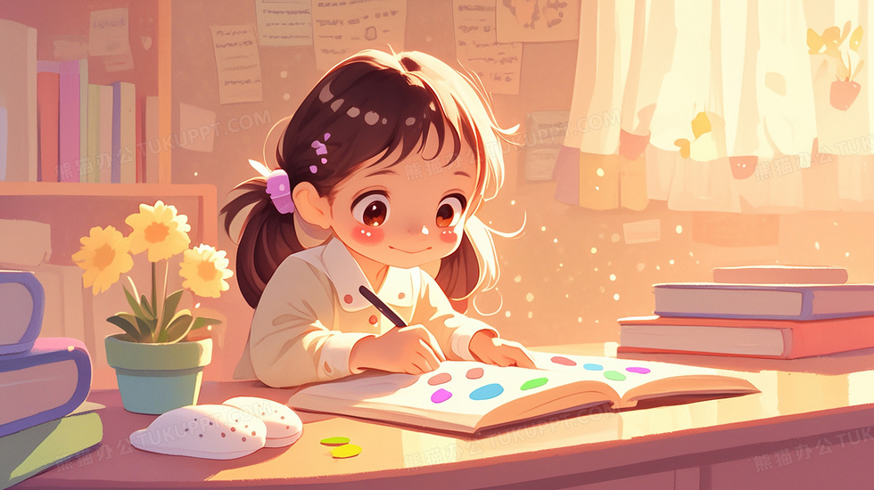 本作品内容为书房学习绘画小女孩卡通插画, 格式为 jpg, 大小3 MB, 图片尺寸为2912 x 1632, 源文件无水印, 欢迎使用熊猫办公。 如认为平台内容涉嫌侵权,可通过邮件:tousu@tukuppt.com提出书面通知,我们将及时处理。