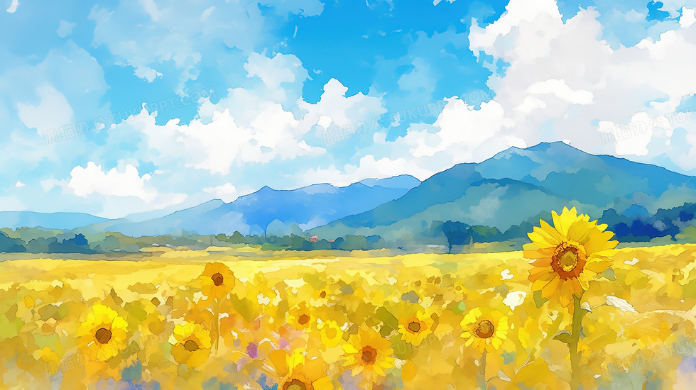 本作品内容为清新水彩风向日葵花海花田花卉插画, 格式为 jpg, 大小3 MB, 图片尺寸为2912 x 1632, 源文件无水印, 欢迎使用熊猫办公。 如认为平台内容涉嫌侵权,可通过邮件:tousu@tukuppt.com提出书面通知,我们将及时处理。