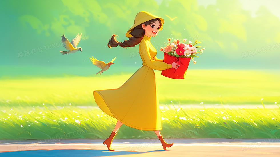 本作品内容为穿着黄裙子走在路上的时尚少女捧着花篮与飞鸟插画, 格式为 jpg, 大小2 MB, 图片尺寸为2912 x 1632, 源文件无水印, 欢迎使用熊猫办公。 如认为平台内容涉嫌侵权,可通过邮件:tousu@tukuppt.com提出书面通知,我们将及时处理。