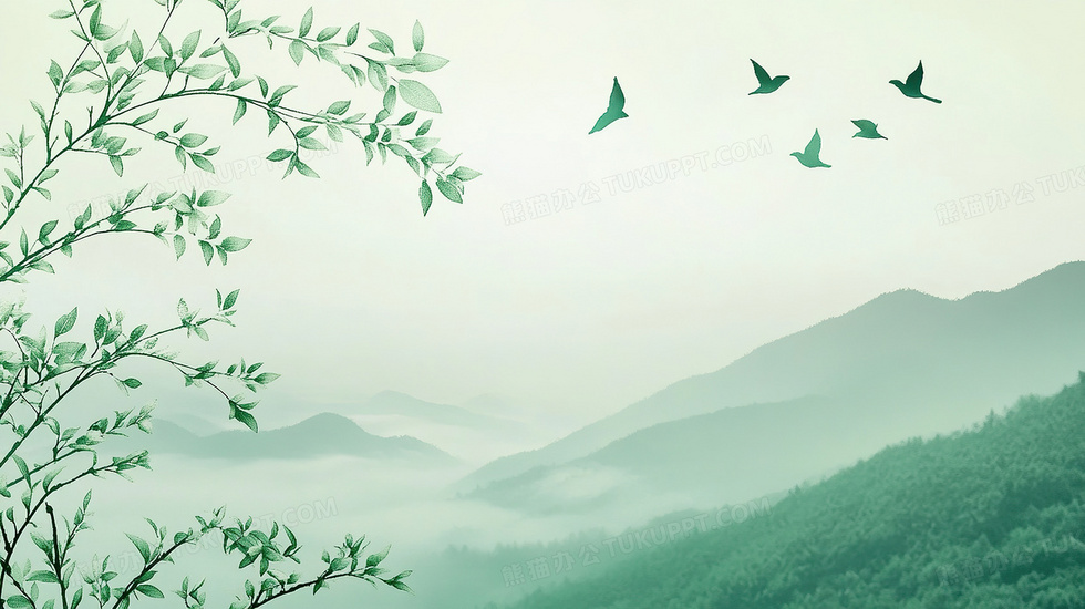 本作品内容为绿色中国风春天山脉背景, 格式为 jpg, 大小3 MB, 图片尺寸为2912 x 1632, 作品中背景图片无需修改, 源文件无水印,可以直接使用, 欢迎使用熊猫办公。 如认为平台内容涉嫌侵权,可通过邮件:tousu@tukuppt.com提出书面通知,我们将及时处理。