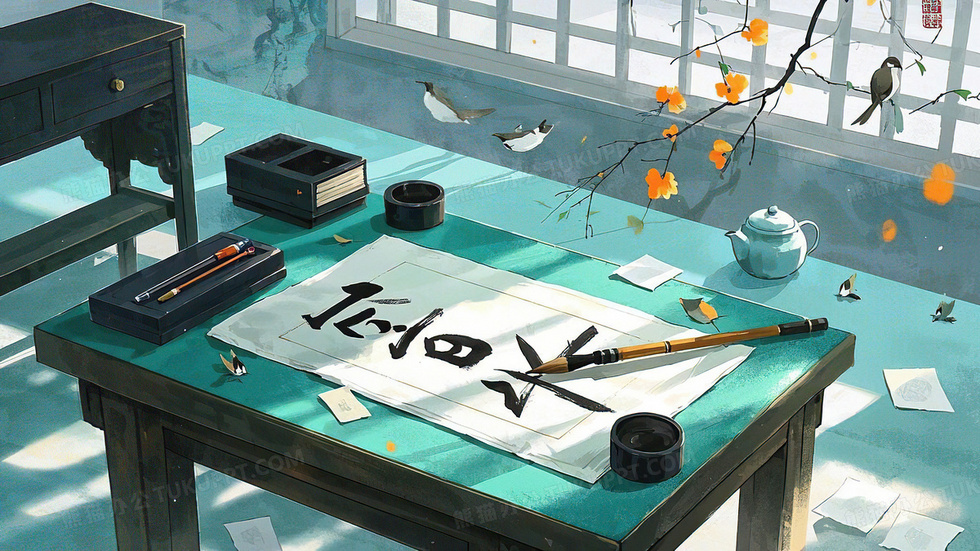 本作品内容为毛笔宣纸传统文化笔墨纸砚插画, 格式为 jpg, 大小6 MB, 图片尺寸为3072 x 1728, 源文件无水印, 欢迎使用熊猫办公。 如认为平台内容涉嫌侵权,可通过邮件:tousu@tukuppt.com提出书面通知,我们将及时处理。