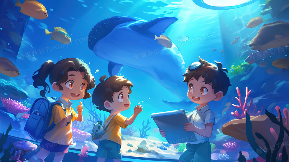 本作品内容为水族馆参观的儿童插画, 格式为 jpg, 大小3 MB, 图片尺寸为2912 x 1632, 源文件无水印, 欢迎使用熊猫办公。 如认为平台内容涉嫌侵权,可通过邮件:tousu@tukuppt.com提出书面通知,我们将及时处理。