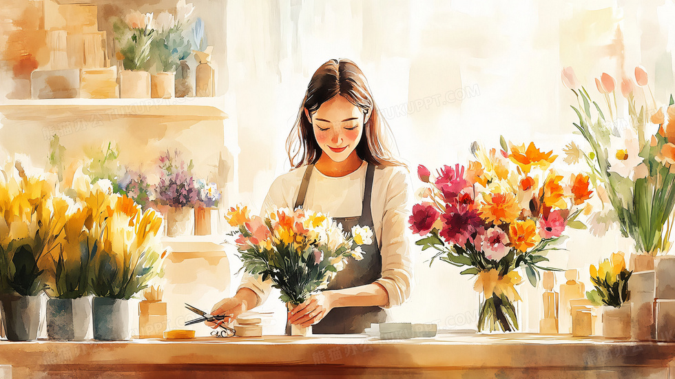 本作品内容为花店里打包花束鲜花店员女孩插画, 格式为 jpg, 大小7 MB, 图片尺寸为2912 x 1632, 源文件无水印, 欢迎使用熊猫办公。 如认为平台内容涉嫌侵权,可通过邮件:tousu@tukuppt.com提出书面通知,我们将及时处理。