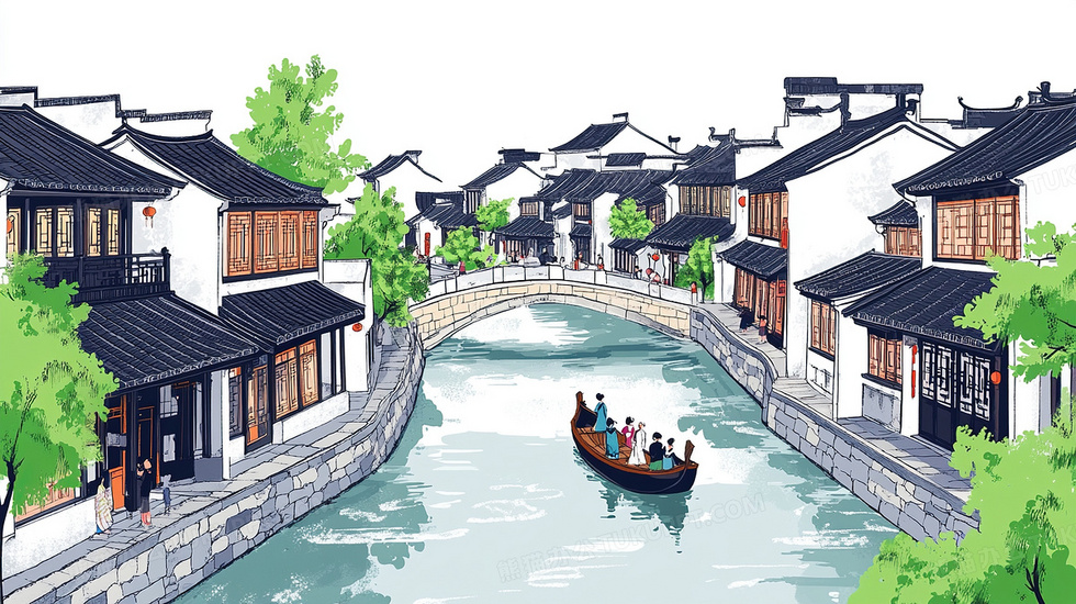 本作品内容为小桥流水划船江南水乡风景小镇插画, 格式为 jpg, 大小4 MB, 图片尺寸为2912 x 1632, 源文件无水印, 欢迎使用熊猫办公。 如认为平台内容涉嫌侵权,可通过邮件:tousu@tukuppt.com提出书面通知,我们将及时处理。