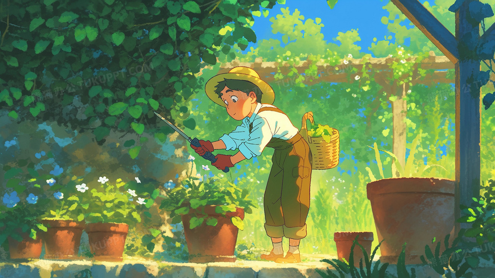 本作品内容为卡通小男孩花园种花卡通插画, 格式为 jpg, 大小3 MB, 图片尺寸为2912 x 1632, 源文件无水印, 欢迎使用熊猫办公。 如认为平台内容涉嫌侵权,可通过邮件:tousu@tukuppt.com提出书面通知,我们将及时处理。