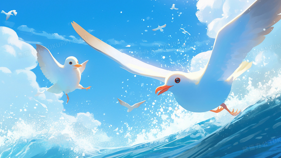本作品内容为唯美蓝天白云海鸥大海插画, 格式为 jpg, 大小3 MB, 图片尺寸为2912 x 1632, 源文件无水印, 欢迎使用熊猫办公。 如认为平台内容涉嫌侵权,可通过邮件:tousu@tukuppt.com提出书面通知,我们将及时处理。