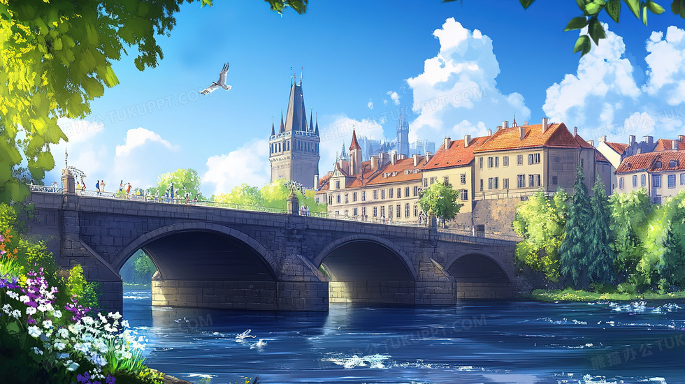 本作品内容为欧式建筑物城市里的石桥插画, 格式为 jpg, 大小4 MB, 图片尺寸为2912 x 1632, 源文件无水印, 欢迎使用熊猫办公。 如认为平台内容涉嫌侵权,可通过邮件:tousu@tukuppt.com提出书面通知,我们将及时处理。