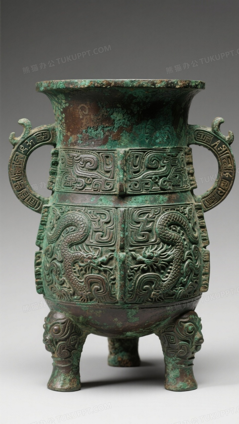 本作品内容为商代的古代青铜鼎器精心装饰着复杂的龙和几何图案, 格式为 jpg, 大小1 MB, 图片尺寸为936 x 1664, 源文件无水印, 欢迎使用熊猫办公。 如认为平台内容涉嫌侵权,可通过邮件:tousu@tukuppt.com提出书面通知,我们将及时处理。
