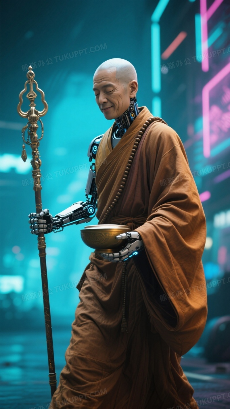 本作品内容为行走的半机械僧人和尚拿着科技机械的法杖和碗, 格式为 jpg, 大小1 MB, 图片尺寸为936 x 1664, 源文件无水印, 欢迎使用熊猫办公。 如认为平台内容涉嫌侵权,可通过邮件:tousu@tukuppt.com提出书面通知,我们将及时处理。