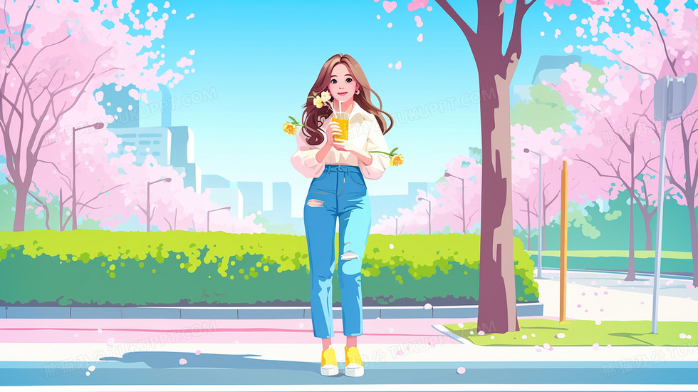 本作品内容为粉色樱花树下手拿花束喝着饮料少女插画, 格式为 jpg, 大小2 MB, 图片尺寸为2912 x 1632, 源文件无水印, 欢迎使用熊猫办公。 如认为平台内容涉嫌侵权,可通过邮件:tousu@tukuppt.com提出书面通知,我们将及时处理。
