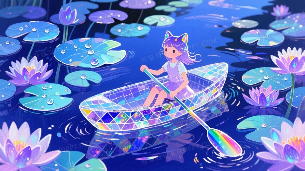 本作品内容为玻璃彩绘质感插画蓝紫色睡莲丛中划船少女, 格式为 jpg, 大小1 MB, 图片尺寸为1664 x 936, 源文件无水印, 欢迎使用熊猫办公。 如认为平台内容涉嫌侵权,可通过邮件:tousu@tukuppt.com提出书面通知,我们将及时处理。