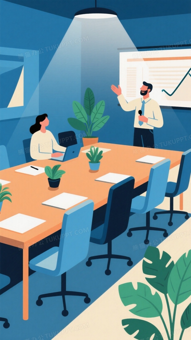 本作品内容为好看的扁平卡通插画呈现商务会议场景, 格式为 jpg, 大小1 MB, 图片尺寸为936 x 1664, 源文件无水印, 欢迎使用熊猫办公。 如认为平台内容涉嫌侵权,可通过邮件:tousu@tukuppt.com提出书面通知,我们将及时处理。