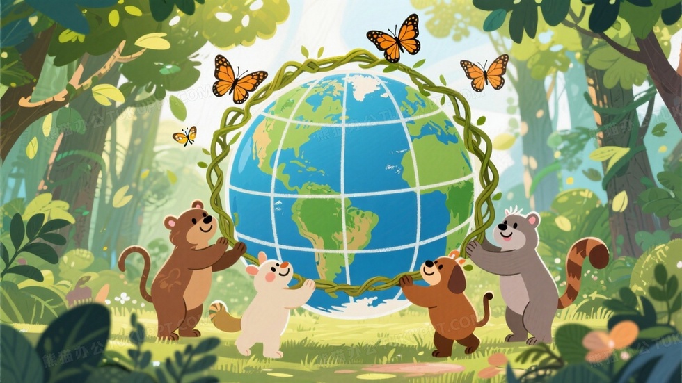 本作品内容为保护地球的卡通插画森林中的动物们齐心协力用藤蔓编织成保护罩守护地球, 格式为 jpg, 大小1 MB, 图片尺寸为1664 x 936, 源文件无水印, 欢迎使用熊猫办公。 如认为平台内容涉嫌侵权,可通过邮件:tousu@tukuppt.com提出书面通知,我们将及时处理。