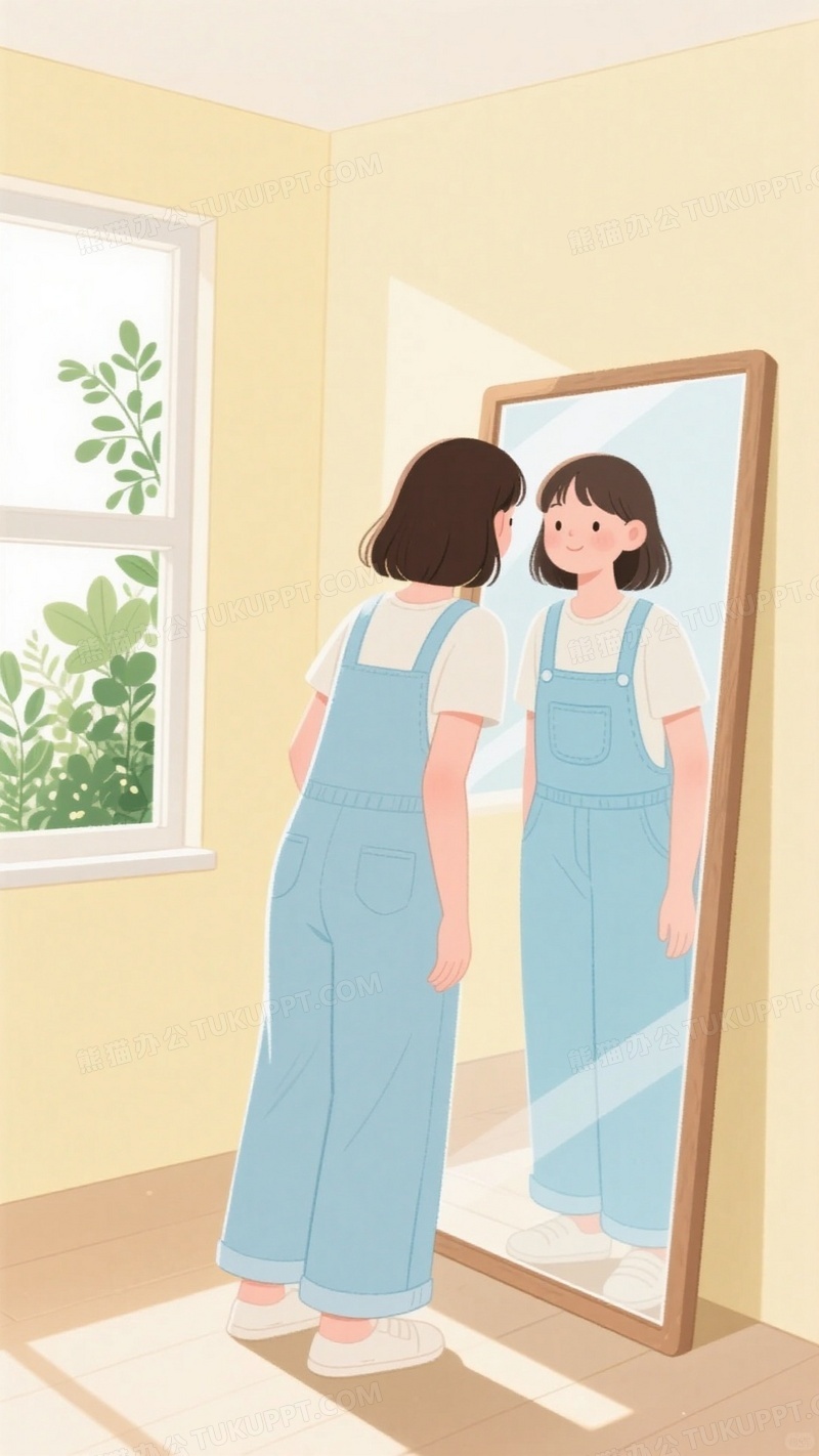 本作品内容为清新风格卡通插画女孩穿着淡蓝色背带裤套装对着全身镜, 格式为 jpg, 大小1 MB, 图片尺寸为936 x 1664, 源文件无水印, 欢迎使用熊猫办公。 如认为平台内容涉嫌侵权,可通过邮件:tousu@tukuppt.com提出书面通知,我们将及时处理。